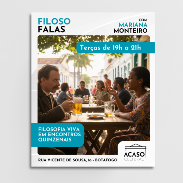 Encontros quinzenais, de aproximadamente 2h de duração, onde temas filosóficos são apresentados de modo a começar e terminar na mesma aula. A cada encontro, pensadores de todos os períodos da Filosofia são trazidos para fomentar a discussão. Medo, amor, morte, liberdade e mitologia grega estão no “cardápio”! A cada tema uma nova oportunidade de juntos pensarmos sobre temas humanos, demasiado humanos…